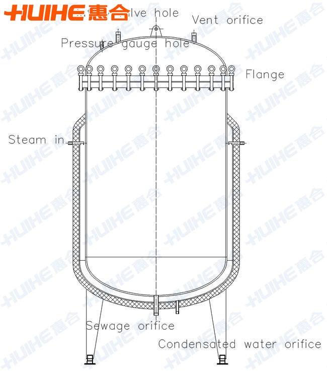 High pressure cooking pot takes a certain pressure steam as heat source (also can choose electrical heating), owns characteristics such as large heating area, high thermal efficiency, uniform heating, short liquid material boiling time and easy to control the heating temperature. The inner pot using acid heat-resistant austenitic stainless steel manufacturing, equipped with pressure gauge and safety valve. It has beautiful outlook, easy installation, and convenient operation, is safe and reliable.