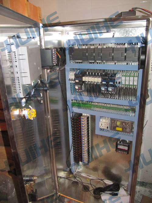 下圖為該全自動(dòng)CIP清洗系統(tǒng)的控制柜內(nèi)部構(gòu)造及PLC顯示屏的運(yùn)行界面。